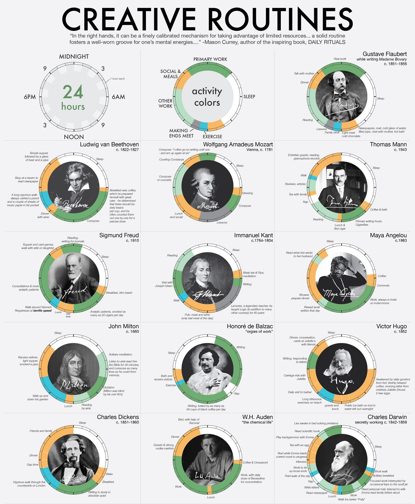 Par exemple, jâaime beaucoup ce graphique qui reflĂšte la variĂ©tĂ© des routines crĂ©atives des plus grands artistes :