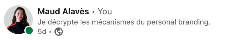 Sur Linkedin, l’endroit parfait pour mettre ta tagline est le “titre”. Chaque fois que tu fais un post, cette petite phrase est l’occasion d’attirer les gens sur ton profil.