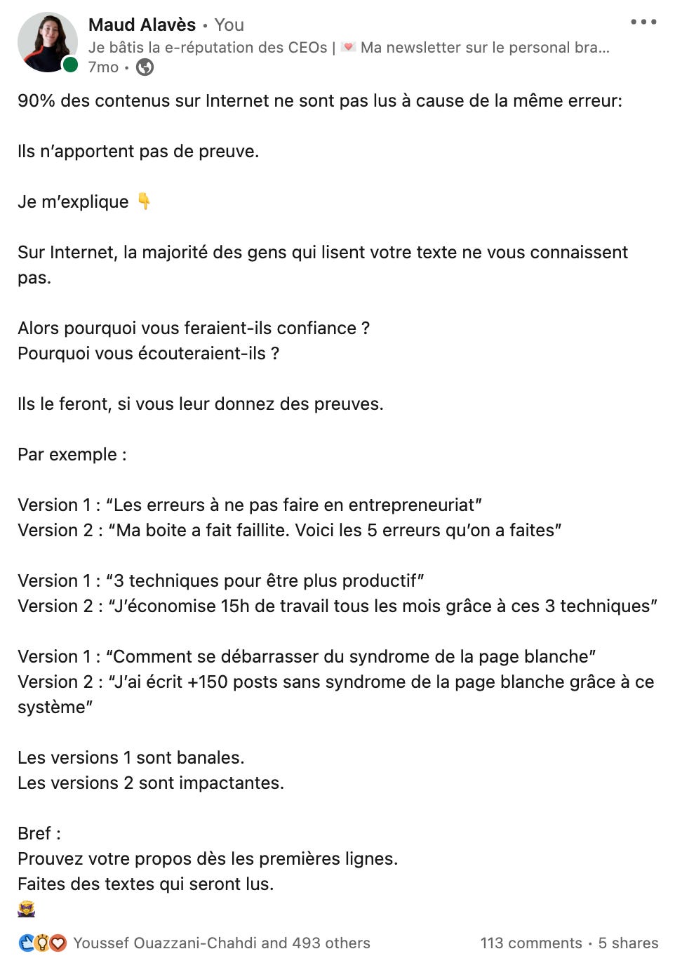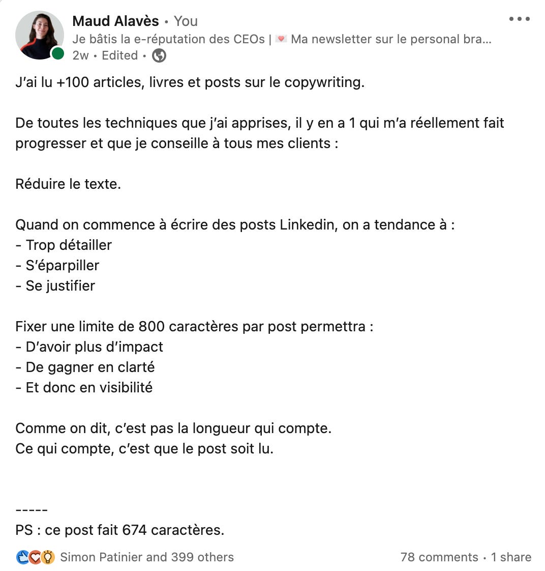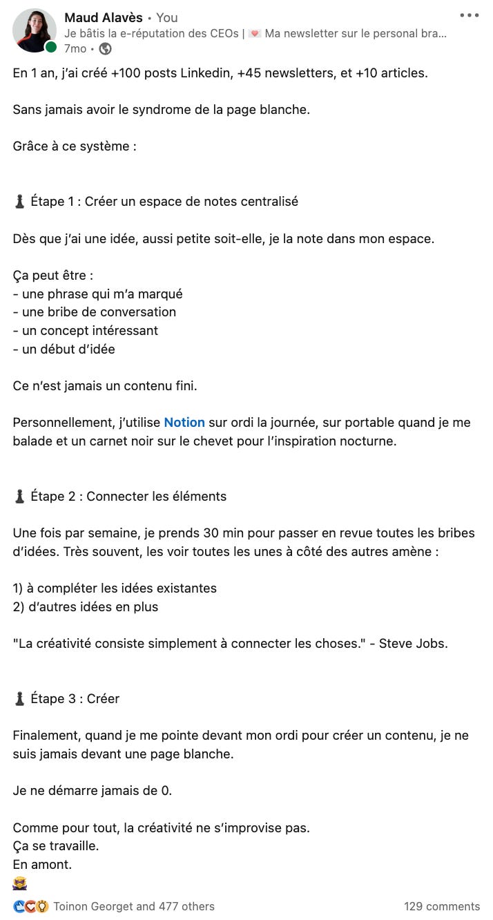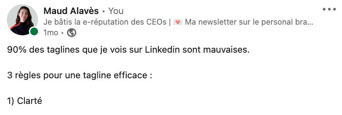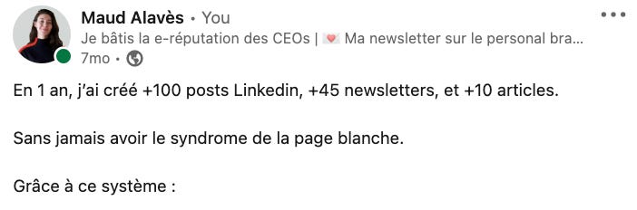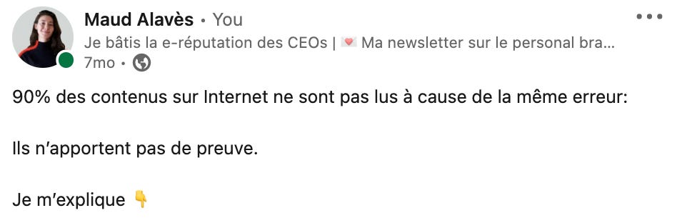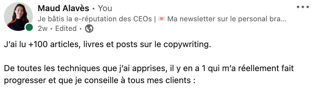 Sur Linkedin, l’accroche, c’est 50% de la réussite d’un post. Si tu réussis à faire cliquer les gens sur le “en savoir plus”, tu as déjà gagné la moitié de la guerre. Surtout pour ce type de post.