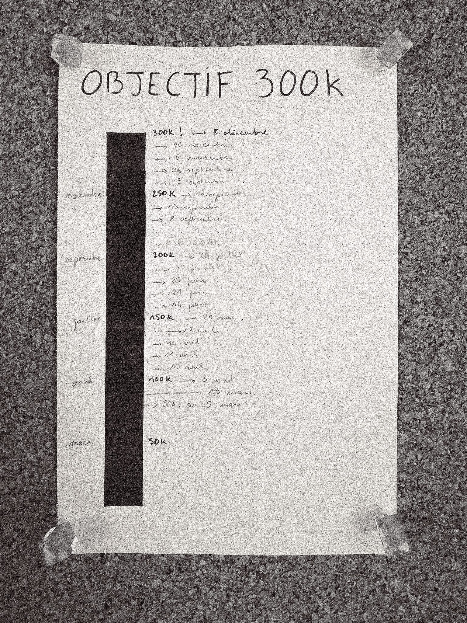 J’ai démarré l’année avec une jauge vide, que je me suis appliquée à remplir à chaque tranche de 10k supplémentaires vendus. J’ai accroché cette jauge bien en évidence dans mon bureau, de sorte à la voir tous les jours et à rester focus.