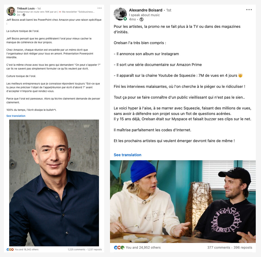 Par exemple, dans le cas du post de Jeff Bezos, beaucoup ont critiqué l’idée dans les commentaires. Pour celui d’Orelsan, beaucoup ont salué le côté innovant. Pour celui sur Justine Hutteau, beaucoup en ont profité pour critiqué Respire. Dans tous les cas, la pratique ne laisse pas indifférent.