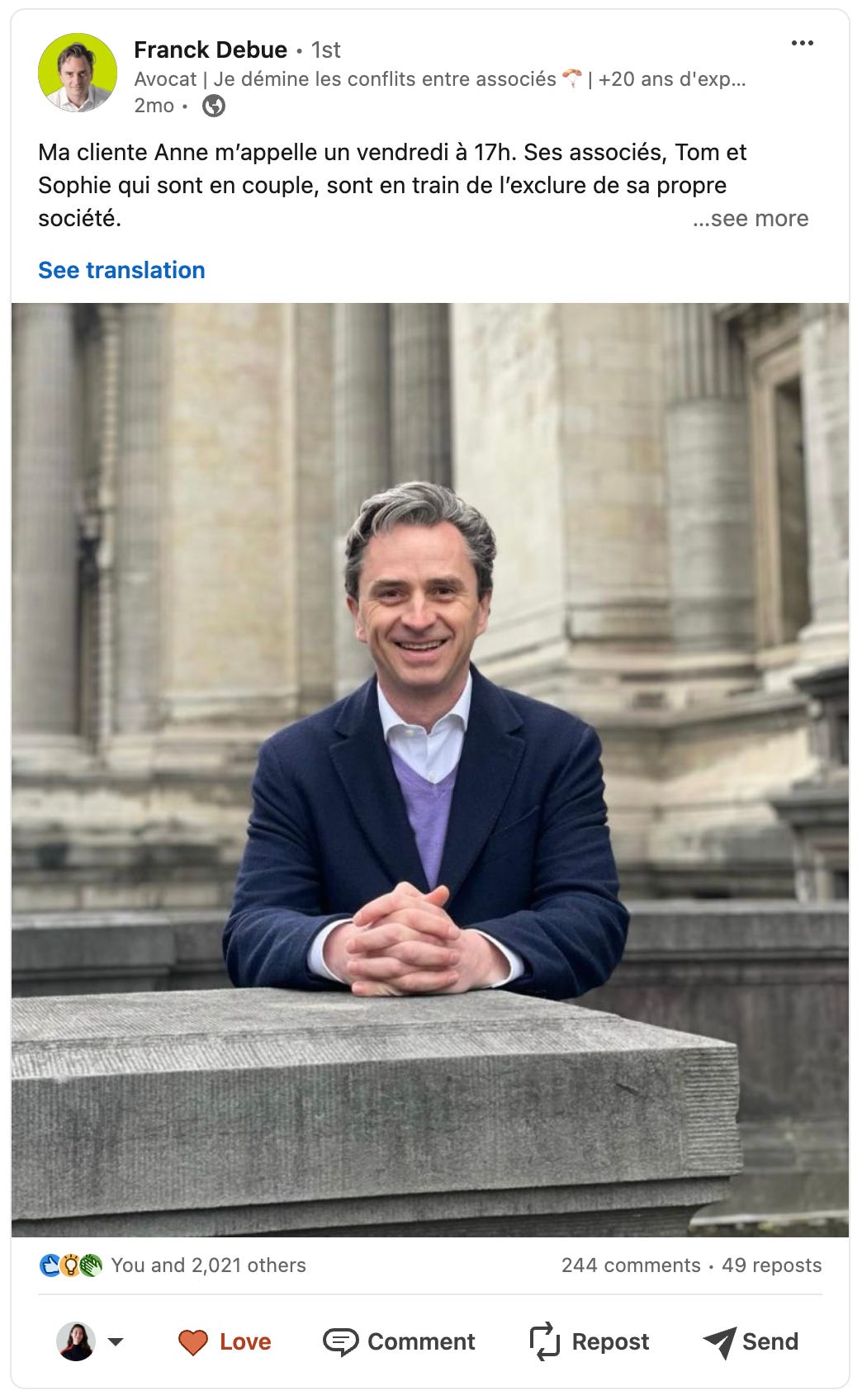 Prenons l’exemple du post de Franck Debue, avocat, ci-dessus. Le conseil technique est donné à la fin : “Quand vous avez un conflit avec votre associé, commencez par éplucher les extraits de compte de la société”. En revanche, il est amené au lecteur par une histoire concrète dans laquelle il peut s’identifier.