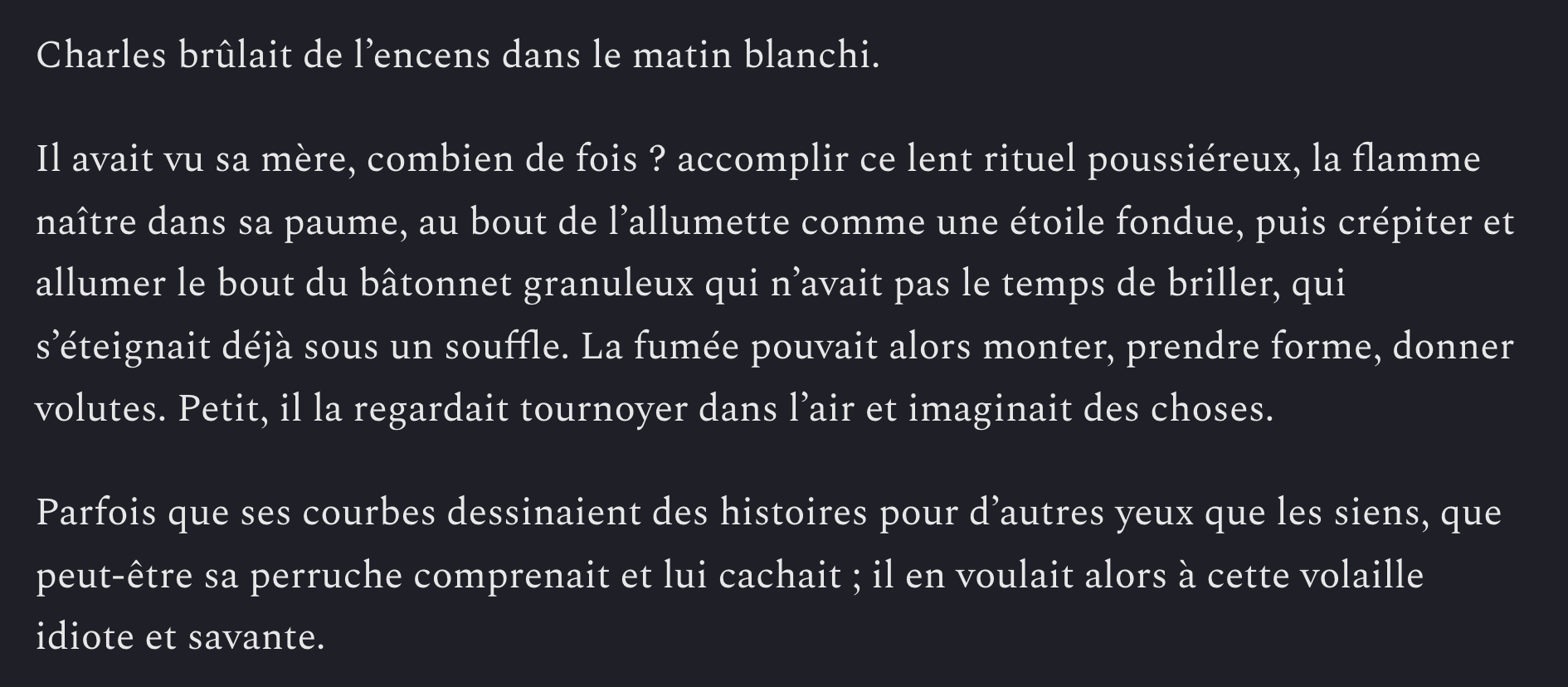 Ses posts étaient d’une incroyable plume, avec de très belles tournures de phrases, des allégories, des métaphores, des rythmes nouveaux, et même des mots que je ne connaissais pas. Mais comme pour le Trivial Pursuit, ils m’ont laissé un goût amer : celui d’être trop bête pour comprendre ce qui était écrit.