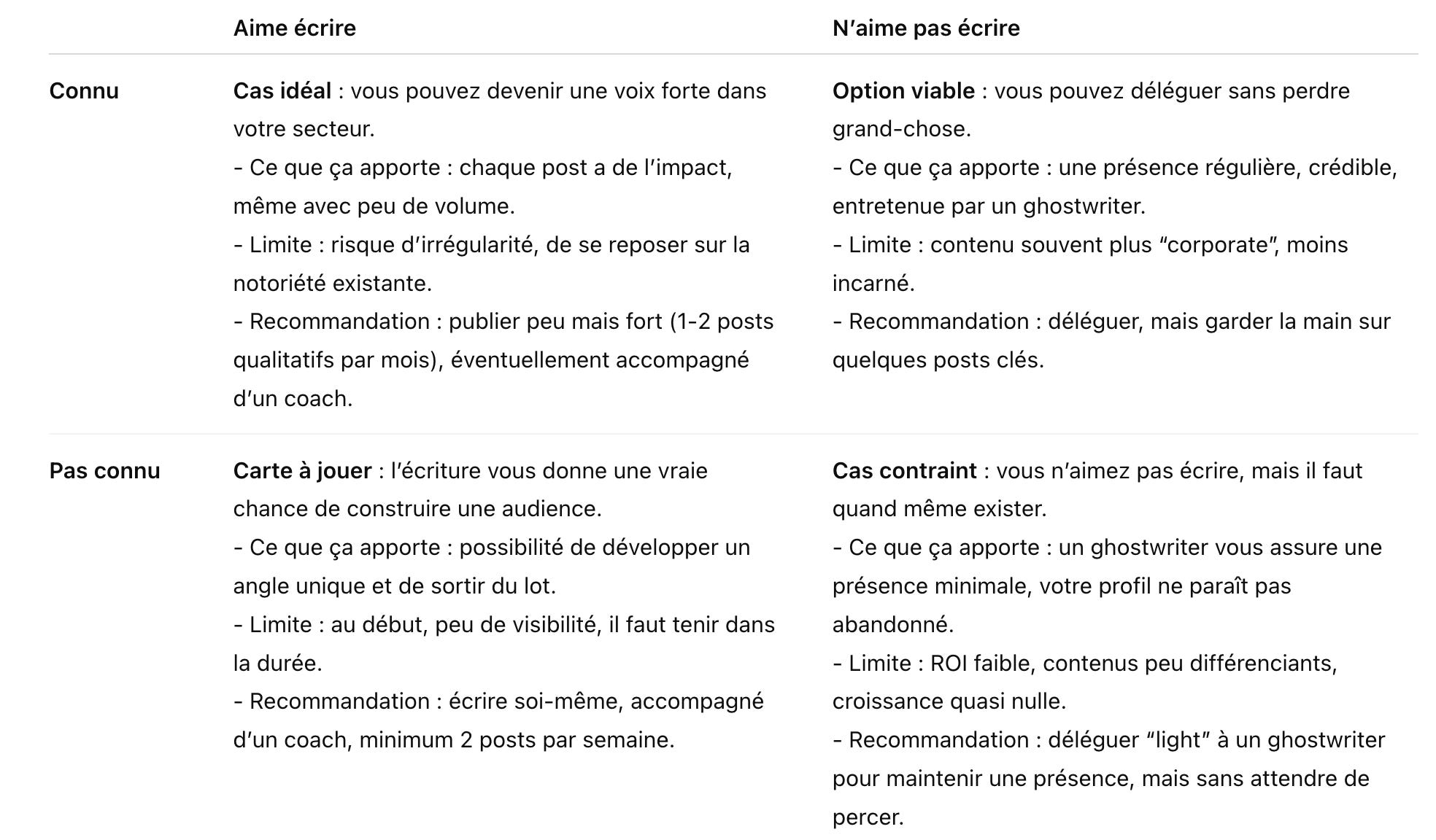 Déléguez. Un ghostwriter vous donnera une présence régulière. Mais il faut être lucide : la plupart écrivent des contenus “génériques”, qui ressemblent à tout ce qui existe déjà. Cela entretient une présence, mais ça ne crée pas une stratégie de personal branding forte.`