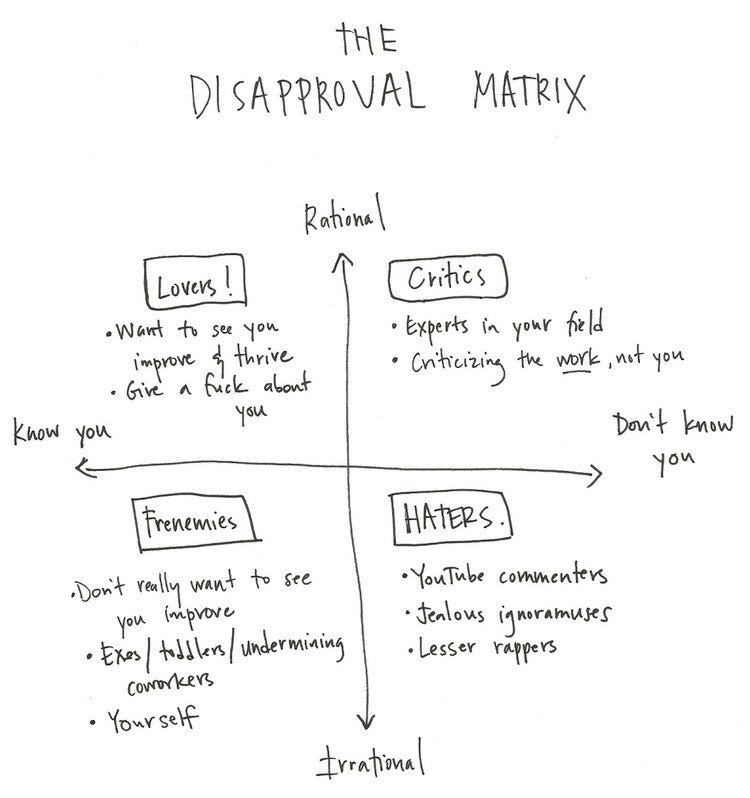 Ce que j’aime dans ce plan d’action, c’est qu’il force à passer à autre chose. Dans son livre, Julia dit aussi qu’il faut apprendre à faire la différence entre la critique constructive et la critique inutile. Dans le fond, je pense qu’on sait très bien faire la différence. Néanmoins, j’ai trouvé cette matrice d’Ann Friedman très utile :