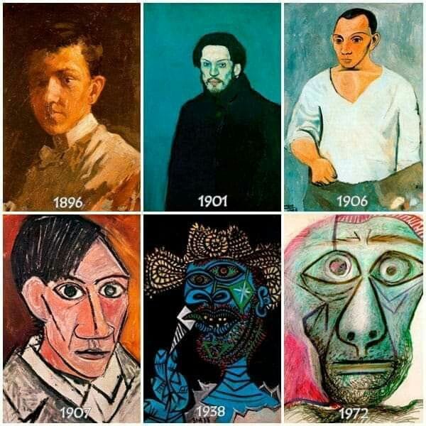 C’est la même chose pour le style en écriture. Il ne se trouve pas. Il se façonne au fur et à mesure des expérimentations. Chercher à trouver son style dès ses premiers textes est du non-sens. Ça serait comme demander à un jeune peintre de peindre son premier tableau comme si c’était son dernier. Prenons Picasso et ses autoportraits ci-dessous par exemple. Le premier et le dernier n’ont tellement rien à voir qu’on pourrait croire qu’ils ont été créés par deux artistes différents. D’une certaine manière, c’est le cas. Picasso à ses 15 ans n’est pas la même personne qu’à ses 90 ans.